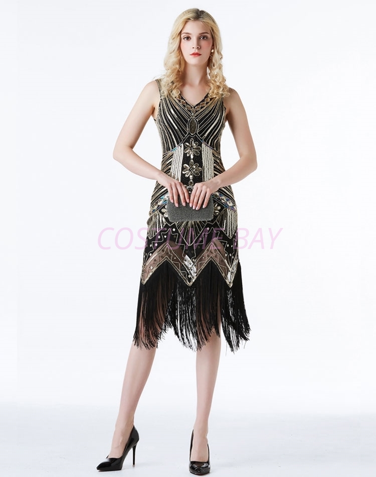 1920s Charleston Deluxe Black/Gold Sequins Flapper Dress. Dress is lined with side zipper.