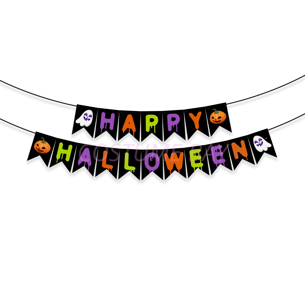 This Halloween flag banner features a fun and spooky "Happy Halloween" design with black flags, ghosts, and pumpkins. Perfect for decorating parties, windows, walls, and doors.