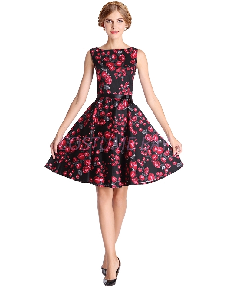 Rockabilly 50s 60s Vintage Evening Retro Pinup Swing Cocktail Dress-Black with red flow