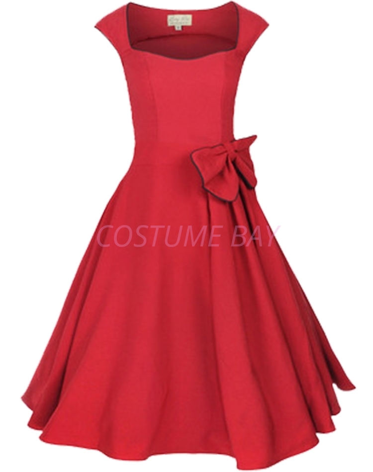 Description: Classic Red Rockabilly Vintage Dress with Black Pipe and Big Bow at Front Left