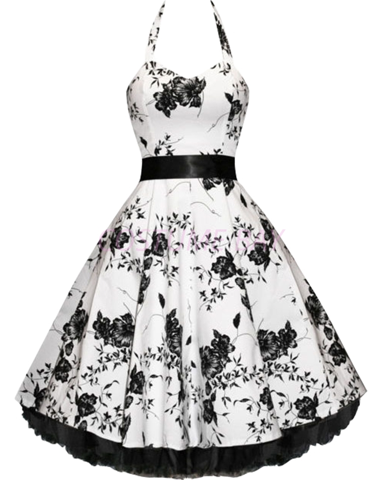 Rockabilly 50s 60s Vintage Evening Retro Pinup Swing Cocktail Dress-White black flower
